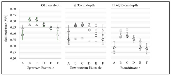 For the bioswale, the soil moisture content at the six identified inflection points for the soil moisture framework (A, B, C, D, E, F) was obtained for 58 storm events at the upstream location from December 2019 to October 2020 and 54 storm events at the downstream location from September 2019 to October 2020. For the bioinfiltration site, the soil moisture content at the six identified points was obtained for 27 storm events from 2014 to 2018. For these selected storm events, the variation in soil moisture at different depths is shown in Figure 7. The soil moisture measurements indicate that there is the most variation in soil moisture at a 10 cm depth for all systems, especially points A and F. The 35 cm depths in all systems tend to show less variation compared to the 10 cm, and there is very little variation in the mean soil moisture at 60/65 cm depths for all framework points. This observation could be due to the proximity to the surface and sensitivity to ET and other atmospheric changes compared to the deeper sensors.