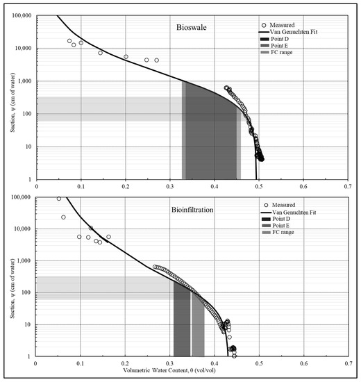 The conceptual framework point D and E for the bioinfiltration range from 0.35 to 0.37 v/v and 0.29 to 0.35 v/v, respectively, for all depths, which corresponds to the suction range between 60 and 200 cm (Figure 8, lower). This range fully overlaps with the range [21,22] recommended (i.e., 61–337 cm suction). In general, the range of point D (shaded light grey in Figure 8) and point E (shaded dark grey in Figure 9) overlap with the FC range of 61 to 337 cm suction (shaded mid-grey in Figure 8) for both GSI sites. As such, this indicates that point D and E in the framework aid in the determination of field capacity.