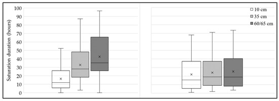 Box plots of duration of saturation for downstream bioswale (left) and bioinfiltration (right) at each soil depth. The middle line is mean, × indicates median, upper, and lower box which are interquartile range, and the line that extends the box is whiskers, which represent datasets outside the interquartile range (covers datasets that are ±1.5 times the interquartile range). The data outside the whiskers are outliers.
