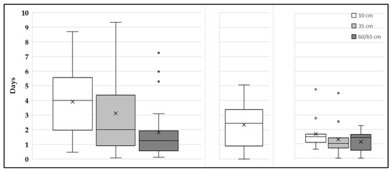 Box plots of recession for downstream bioswale (left) upstream bioswale (middle) and bioinfiltration (right) at soil depths. The middle line is mean, × indicates median, upper, and lower box which are the interquartile range, and the line that extends the box is the whiskers, which represent datasets outside the interquartile range (covers datasets that are ±1.5 times the interquartile range).