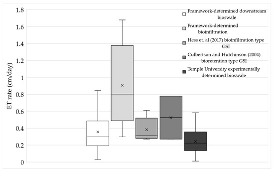 The framework-determined average ET rates for bioswale and bioinfiltration are 0.48 cm/day and 0.91 cm/day, with a range of 0.3–1.7 cm/day, respectively. The range of the framework-determined ET rates of both systems is compared to the GSI ET estimates from the literature and other research (Figure 12). The three sources from the literature include: a lysimeter representing a bioinfiltration GSI with 61 cm of sand media at a nearby site at Villanova, PA, which had an average ET rate of 0.39 cm/day and an ET rate range of 0.27–0.61 cm/day [3,25], a bioretention system in Canada studied by [26] which found a range of 0.27–0.78 cm/day, and finally Temple University conducted research on the bioswale in this study, which determined an average ET rate of 0.25 cm/day and a range of 0.01–0.58 cm/day (between 8 June and 22 September 2019). A study conducted by [8] found ET rates for two urban bioinfiltration sites in New York City to be with 0–0.97 cm/day and 0–0.93 cm/day, respectively.