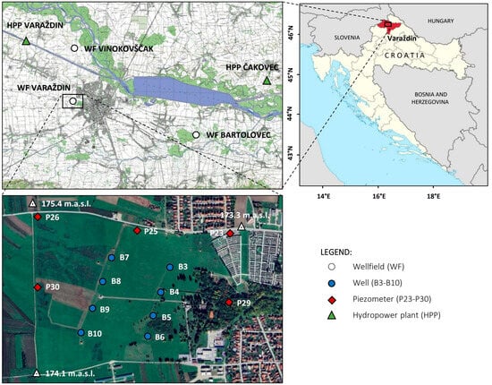 The study area is located in the north of the Republic of Croatia and includes the area of the Varaždin wellfield (Figure 1), which is located near the town of Varaždin. The Varaždin region is one of the most densely populated and economically developed areas in the Republic of Croatia. Groundwater for the Varaždin regional water supply system is pumped into the Varaždin, Bartolovec and Vinokovščak wellfields from the same alluvial aquifer, which is built of quaternary sand and gravel.