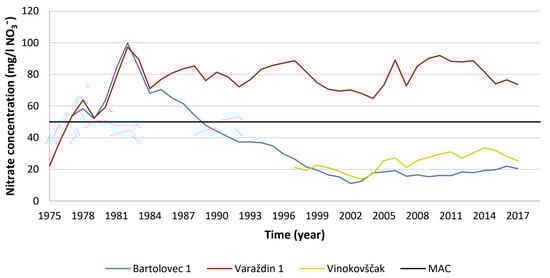 For many years, the nitrate concentration in the Varaždin wellfield was higher than the maximum allowed concentration (MAC), according to the Ordinance on conformity parameters and analysis methods, monitoring and water safety plans for human consumption and according to the EU Nitrate Directive []. At the same time, the nitrate concentration in the groundwater at the other wellfields in the wider area of the town of Varaždin was much lower [], which is adequately shown by the time series of the average annual nitrate concentrations of the wellfields (Figure 3). The curves represent the average annual nitrate concentration of all wells in the upper aquifer in each wellfield.