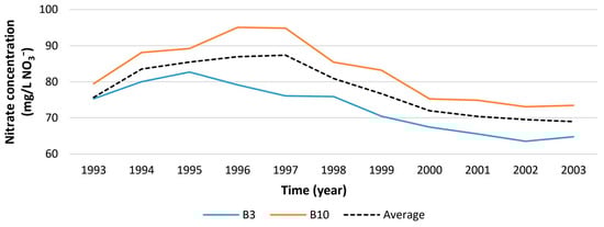 For this reason, the nitrate concentration at all of the groundwater sampling points in the wellfield (wells B3–B10 and piezometers P23–P30) was analyzed, and it was found that there are significant differences in nitrate concentration in the wells in the Varaždin wellfield: in some wells, the concentration is always higher (e.g., well B10), while in others (e.g., B3), it is always lower than the average value of the whole wellfield (Figure 4) []. This relationship was observed in all wells throughout the observation period. Since the nitrate concentration in the wells has such a regular relationship, we felt that our use of average nitrate concentrations in subsequent analyses was justified.