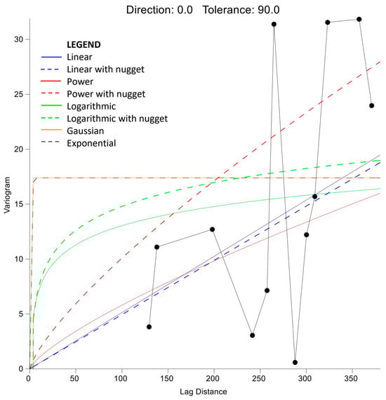 Based on the spatial distribution of sampling locations and the corresponding average nitrate concentrations during the observed period, 2D models of the spatial distribution of nitrate concentration were created using several interpolation methods: (1) kriging, (2) minimum curvature, (3) polynomial regression, (4) radial basis function, (5) inverse distance to a power, (6) nearest neighbor, and (7) moving average. Since the kriging method is very commonly used for such purposes [,,,,], an additional experimental variogram was constructed for this interpolation method, in which the following theoretical variograms were fitted: (a) linear, (b) linear with nugget, (c) power, (d) power with nugget, (e) logarithmic, (f) logarithmic with nugget, (g) gaussian, and (h) exponential (Figure 5). Hence, 14 different models were created. For each 2D model, the location of the point source of pollution was assumed, and the distances between the assumed and measured location d were determined. Golden Software Surfer 8.0 was used for this purpose.