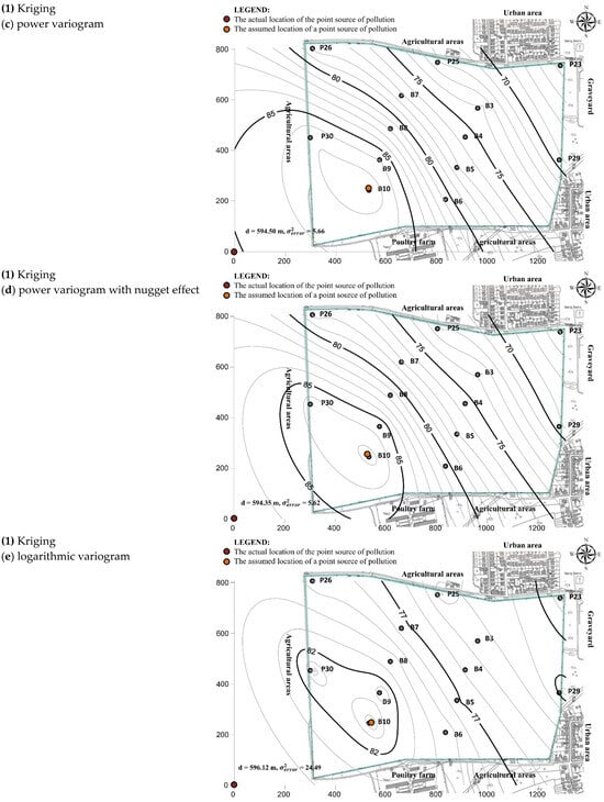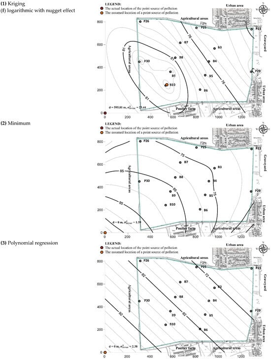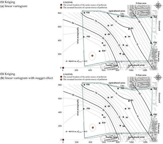 The distances between the measured location of the point source of nitrate pollution according to [] and the locations assumed by the interpolation methods used can be clearly seen in Figure 6. The results of all models show an increase in concentration in the northwest–southeast direction. However, for some methods, the highest concentration is within the model domain (kriging–linear variogram, kriging–linear variogram with nugget, kriging–power, kriging–power with nugget, kriging–logarithmic, kriging–logarithmic with nugget and radial basis function), while for others, this point is located at the very edge of the domain or, more precisely, at its origin (minimum curvature and polynomial regression). Moreover, the four methods used did not give good results (kriging–gaussian variogram, kriging–exponential variogram, nearest neighbor, and moving average) and it was not possible to determine the point with the highest nitrate concentration. Therefore, they can be characterized as methods that are not suitable for this type of analysis. For this reason, the results of these methods were not considered in subsequent analyses.