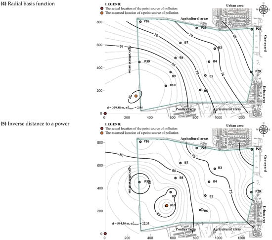 Interpolation methods are very commonly used to evaluate groundwater level [,,], temperature variations [], and the spatial quality of various parameters. Kriging and idw are cited as the most commonly used methods [,]. Thus, the idw method has been used for the interpolation of heavy metals in groundwater in the Dehradun district in India [], while the Kriging method has been used for the spatial interpolation of the water quality index in the Khyber Pakhtunkhwa province in Pakistan []. The results in this paper show that different spatial interpolation methods yield different maps from the same data, which is consistent with previous studies []. The results of previous studies also indicate that the Kriging interpolation method usually gives better results than the inverse distance to a power [,], and the results in this work confirm what has been said, which can clearly be seen from the deviation values shown in Table 1. The radial basis function method is also mentioned as a good method for determining the spatial distribution of nitrogen compounds in groundwater [], and this is confirmed by the results obtained in this work, where the value of the variance of the estimation error was 2.94, while the deviation values at the control points were minimal.