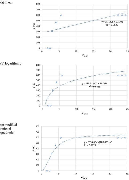 As expected, each of the interpolation methods and tested variograms resulted in a different spatial distribution of nitrate concentration and, accordingly, in a different value of the variance of the estimation error and the distance d between the measured and assumed location of the point source of nitrate pollution (Table 2). In other words, it can be recognized that the distance d is a function of the variance of the estimation error . As the value of the variance of the estimation error increases, the distance d also increases and vice versa. The smallest values of and d were obtained for the interpolation method minimum curvature, while the largest values were obtained for the kriging method with logarithmic variogram. In order to prove the hypothesis H0, a functional dependence (d) was interpolated using the data from Table 2, and the resulting approximation is shown in Figure 7. For this purpose, the program Statistica 13.5.0.17 TIBCO Software Inc. was used.