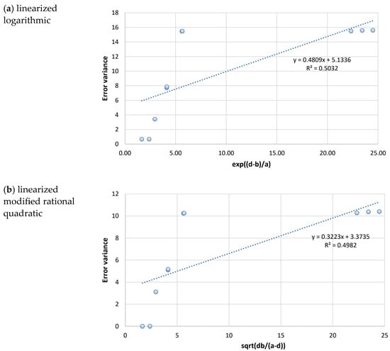 Since the amount of available data points from Table 1 is 10, the number of degrees of freedom in the t-test is 8. Accordingly, the t-value for the linearized logarithmic model was determined to be 2.846, and for the modified rational quadratic model, the t-value was 2.818. These values should be considered with respect to the established critical value tα = 2.306. Since the obtained t values are higher than the critical value tα, the functional dependence can be considered reliable for both models, confirming the assumption that the distance d between the measured and the predicted location of the point source of pollution is a function of the variance of the estimation error . In other words, it can be concluded that the following implication holds: