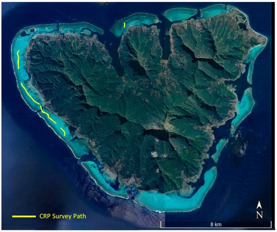 Map of CRP surveys collected from the reefs of Mo’orea, French Polynesia (lat. 17.5, long 149.8); 2021 boat-towed electrical resistivity continuous resistivity profiling (CRP) surveys are shown in yellow. Profiles and their geographic coordinates are provided in Supplementary Material.