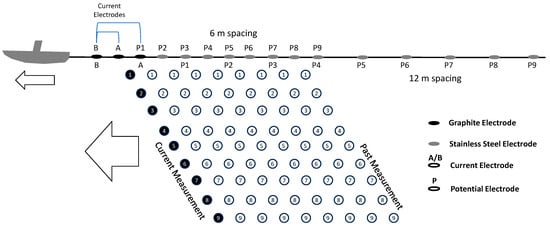 ER profiles can be collected using a boat-towed electrode array to profile sub-bottom ER structure in freshwater and marine environments []. Electrode arrays that collect data while moving have more limited options with respect to measurement strategies than static arrays. Figure 1 illustrates data collection for a boat-towed CRP survey for an eight-channel resistivity system after []. In this example, the first two electrodes on the streamer are used to inject current and the remaining nine nodes are used to measure electrical potential. As the potential is measured farther from the current pair, resistivity is measured at greater depth. This is illustrated by the pseudosection shown schematically in Figure 2: Electrode layout for boat-towed CRP survey showing the 6 m and 12 m spacing options to vary measurement depth. Resistivity measurements are organized in a “pseudosection” illustrated by the numbered circles. One diagonal of data is collected at each acquisition time. These measurements cannot be repeated as the boat is moving continuously. For our system, an Advance Geosciences Incorporated (AGI, Austin, TX, USA) 8-channel, 200-watt system, the streamer nodes are constructed of stainless steel and graphite. Graphite is used for current injection to prevent corrosion in seawater. Boat speeds are kept to below about 4 knots (7.4 km/h) to allow time for acquisition. Even at these slow boat speeds, however, 10 s of kilometers of data can be collected in a single day. A GPS system and depth transducer are linked to the system via a wireless connection so that the profile can be geolocated while accounting for the thickness of the water column. The datafiles collected during the survey are ingested into the software EarthImager 2D® to perform the inversion and create a continuous profile.