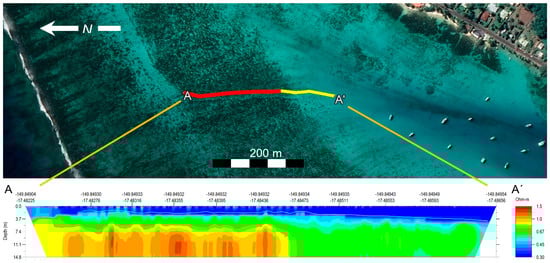 Electrical resistivity can provide a means by which sub-reef geologic structures can be profiled non-invasively invasively [,,]. The premise is that, when an electrical current is passed through the subsurface, the measured voltage-drop will reflect a combination of the porosity of the subsurface sediments and the salinity of the subsurface fluids. Therefore, in seawater-saturated sediments, electrical resistivity profiling produces only an estimate of porosity, whereas, in homogenous aquifers, such profiles would indicate variations in groundwater salinity. Given the wide range in porosity between unconsolidated coral sediments and lithified coraline structures [,], electrical resistivity profiles can elucidate shallow sedimentary structures in reef flats if pores are saturated with seawater.