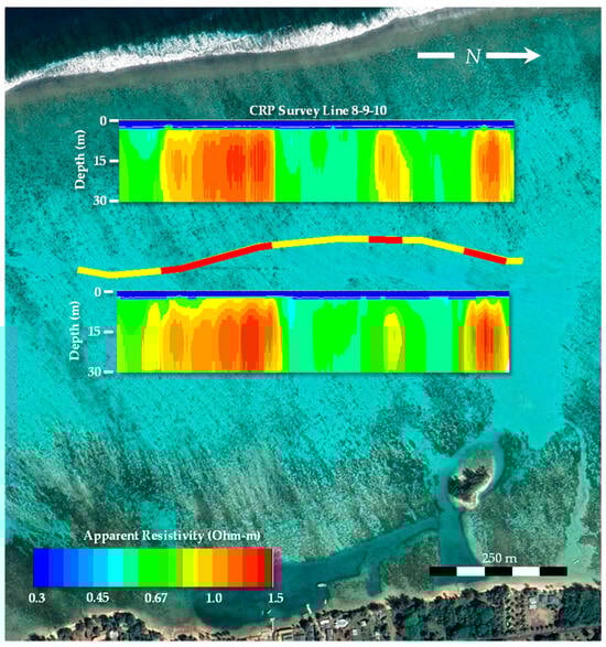 CRP profile with 6 m node spacing over coral reef and lagoon sediments. Resistive features are indicated in the survey course in red.