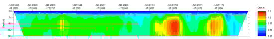 Some authors have observed resistive anomalies on reef flats surrounding carbonate islands and attributed them to confined freshened water [,,]. Such a determination of freshened porewater is difficult to make with confidence, given the confounding effects of porosity and the cementation factor (Equation (1)). Importantly, substrata on reef flats are expected to be composed of loose carbonate detritus or sand, lithified coral structures, and cemented carbonate material. Strata can, consequently, have a wide range of porosity and cementation factor, which can affect measured bulk resistivity, even when pore-fluid resistivity is constant. Subsurface resistive anomalies measured using ER tomography may be interpreted with respect to contrasts in porosity or pore fluid salinity.