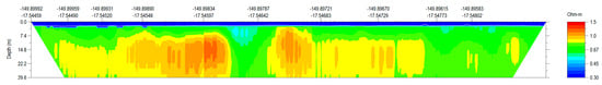 Drilling and coring operations have been used to characterize subsurface stratification of tropical reefs, mostly on atolls and particularly those with a history of nuclear testing. On Entewetak atoll, Marshall Islands, a site of nuclear testing by the United States, three deep and twenty-one shallow cores were collected on islets (motu) []. Chevalier [] reports that a hundred shallow drillings between 15 and 30 m deep were carried out on Mururoa Atoll. This atoll in the Tuamotu Archipelago was also a site of nuclear testing. Ayers et al. [] report on extensive drilling and coring on Deke Island on the Pingelap Atoll of the Eastern Caroline Islands. A review of this literature did not reveal continuous structures in Holocene sediments that are of a size comparable to the resistive features mapped by our surveying (30–200 m), however.
