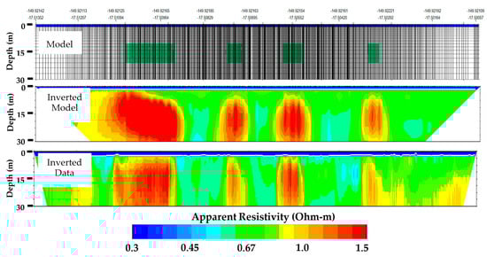 We created synthetic models to assess the ability of ER CRP surveys to identify ER heterogeneities in the reef flat. In this trial-and-error exercise, an attempt was made to approximately replicate the profile 8-9-10. The process begins with hypothesizing a numerical resistivity model (Figure 7, top). Our model consisted of three isolated resistive features that extended between 10 and 20 m below sea level and were assumed to have an ER of 10 Ω-m, considered to be an upper limit of bulk resistivity for vuggy carbonates as reported by Jackson [,]. The background was assumed to have an ER of 0.5 Ω-m (typical for our measured profiles) and seawater 0.27 Ω-m (based upon ocean water salinity). The model grid reflects the actual distribution of measurements collected from a profile (5-26-1) to provide a realistic density of grid spacing. The ER measurements that would be collected using this measurement density are simulated in forward finite element modeling to produce an array of apparent bulk resistivity measurements called a pseudosection (see Figure 2). This pseudosection is then inverted using the same parameters used for inversion of actual measured pseudosections to create a synthetic inverted resistivity profile.