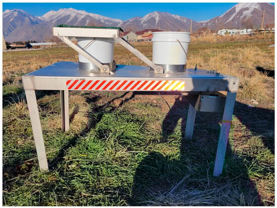The geologic materials in the deposition samples were obtained from the sample network and design reported by Barrus et al. []. This earlier work, and the samples we analyzed here, were designed to quantify total AD to the lake, not to collect dust. For this dust attribution study, we used samples taken at five sites surrounding the lake. The sampler design, seen in Figure 1, consisted of a dry deposition bucket with 3–4 L of water and an empty wet deposition bucket for precipitation with a lid moving to cover one bucket at a time. The dry bucket collects any particulates that contact the water surface, and the wet bucket collects precipitation. Details on sampler placement, design, and operation are provided in []. The operation, maintenance, and sampling procedures were performed in accordance with the design of previous studies [,].