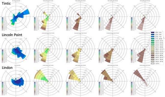We obtained wind data from the Utah Climate data center for 6 different weather stations around Utah Lake []. The data consists of 10 min average data for wind speed and direction from 1 January 2017 to 7 July 2022. The data set contains 1.6 million total records. Figure 2 shows five different wind roses from three weather stations located around Utah Lake, selected to demonstrate different wind regimes. The color scale for all the plots is the same. The length of each segment on the roses indicates how frequently the wind blows in that direction (expressed as a percentage of time over the study period), while the color represents the wind speed. The panels, from left to right, show wind roses based on all winds, and winds over 15, 20, 25, and 30 km/h. For panels 2–5, the segment length is scaled to represent percentages only for winds in that speed category rather than the entire study duration. Winds at the Tintic weather station (top row) show that the prevailing wind direction, considering all winds, is from the northeast (left panel); however, for winds over 15 km/h (other panels), it is from the south/southwest. Close examination of the left panel shows these higher winds as small segments, but difficult to see. The middle row, Lincon Point weather station, shows low-speed prevailing winds almost exclusively from the southeast, while higher speed winds are almost exclusively from the southwest. The bottom row, Lindon weather station, shows prevailing winds without a single dominant direction, though nearly all winds over 15 km/h are from the northwest.