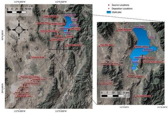 Research by Carling et al. [] looked at sources and composition of atmospheric deposition of dust on the Wasatch Front, the region bordering Utah Lake, finding distant desert playas in southwest Utah to be the main source of deposition [,], with dust being transported by southern winds funneled by area geography. However, these studies focused on larger wind events that average only 4.3–4.7 events per year, used deposition sampler designs that discriminate against local sources, and never tested the samples against local areas. While Carling et al. [] found distant desert playas to be the main source of dust on the Wasatch Front, other works have shown proximal sources to be an underrepresented source in AD studies []. We extend this work by testing both local and distant sources, and, specifically, evaluating dust deposited near the shore of Utah Lake.
