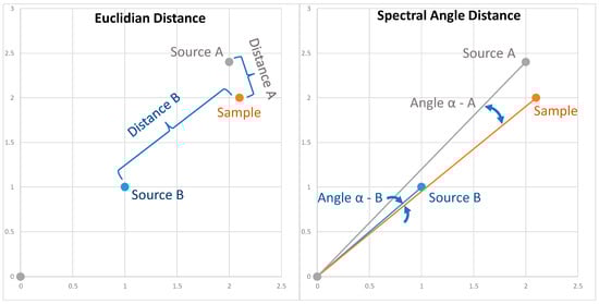 A comparison of two distance metrics between sources and a deposition sample. Source A is closest in Euclidian space (left panel) and Source B is closer in Spectral Angle space. Source B is a diluted version of the sample. Spectral Angle is magnitude or concentration invariant.