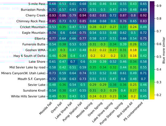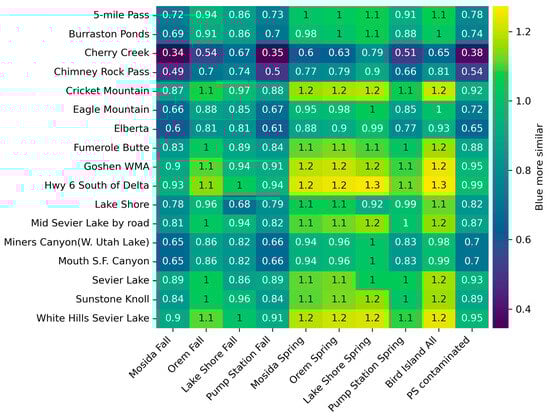 We compared each of the deposition sample locations with each of the dust source locations using the spectral angle metric. Figure 6 shows the pair-wise results of the spectral angle analysis as a heat map, with blue, meaning lower angles, being the most similar. Cherry Creek is seen near the top of the map with a dark horizontal line denoting low spectral angles between deposition samples. We found high similarity, low-spectral angles between the Cherry Creek source sample and all the lake deposition sample locations. The Lake Shore deposition site is the least related to the Cherry Creek source. The Chimney Rock source (Figure 4) was next most similar source to all the deposition samples (Figure 6).