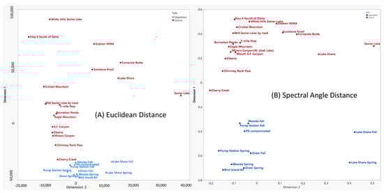 Multi-Dimensional Scaling (MDS) plots place similar 23-dimensional samples close together in two-dimensional space. Deposition sample locations are blue, while source locations are red. The left panel (A) is based on the Euclidean distance between the points, while the right panel (B) is based on the Spectral Angle distance metric.