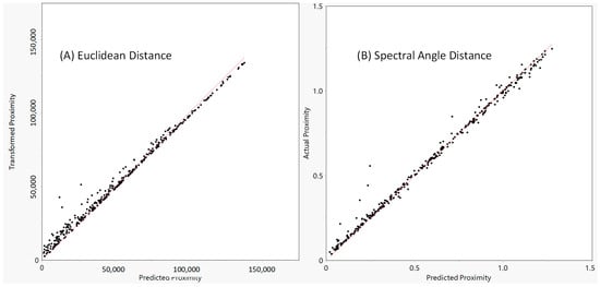 Shepard diagrams for the MDS plot showing the predicted distance or proximity in two-dimensions versus the actual proximity in 23-dimensions for the Euclidean distance on the left (A) and the Spectral Angle distance on the right (B).
