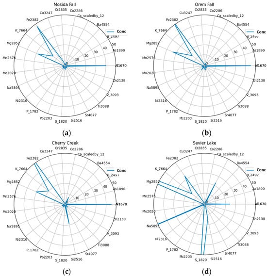 Radar plots present muti-dimensional data in an easily interpreted form with each element plotted on radial lines. The shape of the plot presents the concentration ratios among the various elements. These shapes are invariant with dilution or concentration, but clearly show variations in relative concentrations among the elements. Figure 10 shows that the Cherry Creek source sample has a shape that is visually similar to both the Mosida fall and Orem fall deposition samples, but different from the Sevier Dry Lake source sample. Figure 10 shows that the main shape difference between the Cherry Creek source sample and the lake deposition samples is the high silica and calcium concentrations in the Cherry Creek sample. We attribute this to sample preparation, where the Cherry Creek sample had larger sand and limestone particles which would increase silica and calcium concentrations, which were not transported and captured in the deposition samples. To test this hypothesis, we sieved the Cherry Creek sample with a 150-µm screen, but found no major difference in the shape. We did not attempt to sieve the sample for smaller sizes, which could more easily be transported by wind. A 150-µm sample would only be transported under high winds and for short distances [,]. The similar shapes of the Mosida and Orem deposition samples indicated that dust sources are likely the same, supporting the claims that dust deposition across the lake does not change significantly.