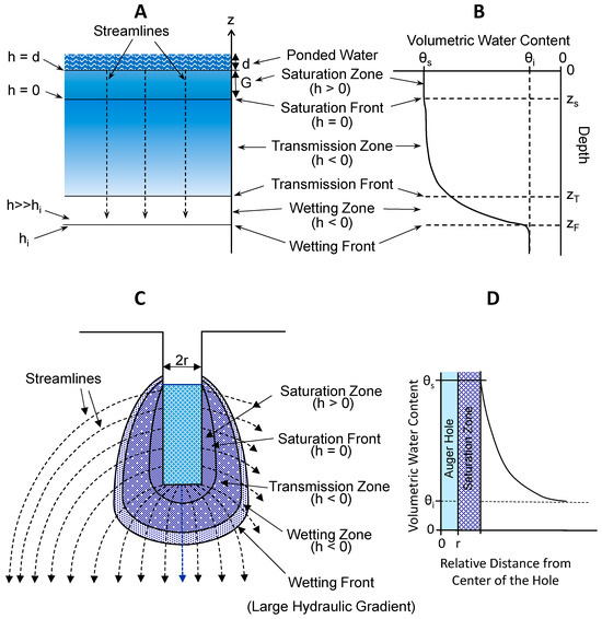 Idealized schematic diagram of the wetted regions (A) and water content distribution with depth (soil water profile) (B) for vertical infiltration under a constant depth of ponding, and wetted regions (C) and water content distribution as a function of distance (D) around a cylindrical hole under a constant depth (head) of water in the hole.
