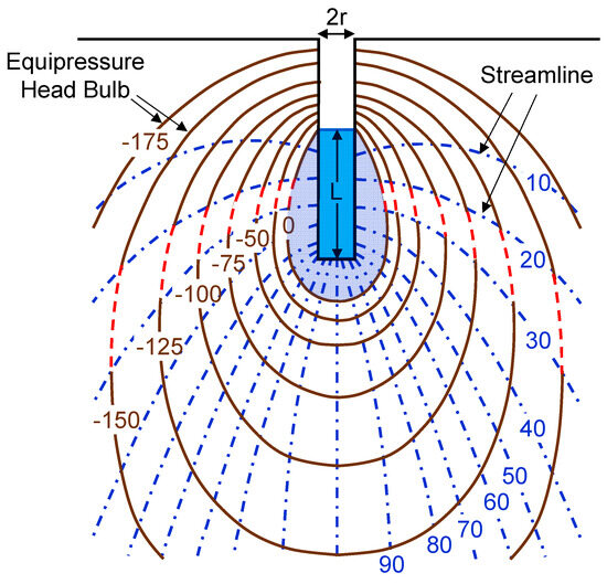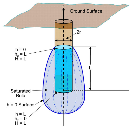 Outside the saturated bulb, the pressure head and soil water content decrease in tandem reaching the background (initial condition) levels away from the hole. The points for any constant pressure head (hereafter, referred to as the equipressure head surfaces) form a bulb-shaped volume, as shown by Amoozegar [33] and represented in Figure 3.