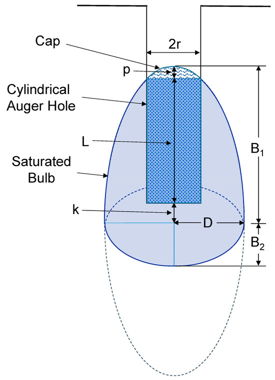 We chose the lower half to be an oblate spheroid, with axes B2 and D, and selected the length of B2 such that the ratio of (B2 + k)/D < 1.0. This ratio is in agreement with the analysis conducted by Stephens [43]. The surface area of the saturated bulb is the sum of the surface areas of the upper and lower half-spheroids minus the surface area of the cap above the water level in the hole.