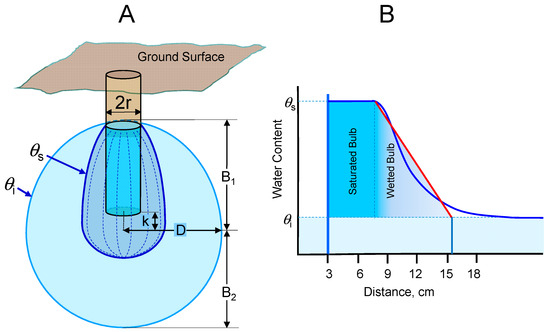 Schematic diagram of the saturated and wetted bulbs (A), and the soil water content distribution with distance from the center of the bulbs (B).