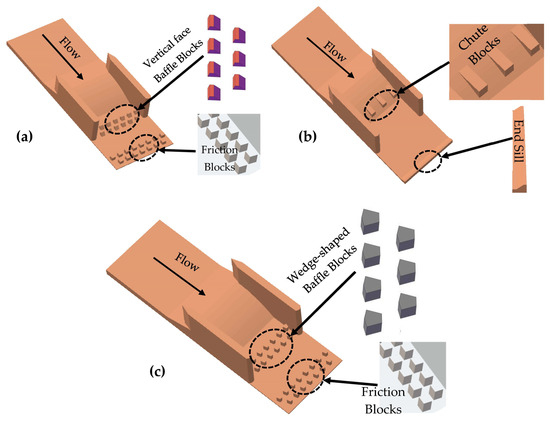 Energy dissipation arrangement, (a) old basin (Type I), (b) remodeled basin (Type II), and (c) WSBB basin (Type III).