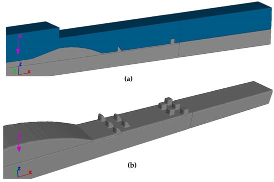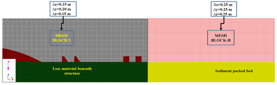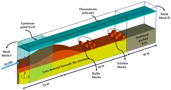 Two structural mesh blocks are employed to solve the solid and fluid domains. The first block covers solid geometries of the models, which ranges from Xmin = 15 m to Xmax = 71 m. In total, 1,492,000 mesh cells are utilized to resolve the basins’ geometries and appurtenances. On the other hand, the second block is extended from Xmin = 71 m to Xmax = 100 m, which also includes 30 m of erodible bed. A total of 222,720 mesh cells are employed for the sediment packed bed, as shown in Figure 4. It is worth mentioning that, in the first block, the HJ and velocity fields are closely assessed, while, in the second block, the retrogression and scour patterns are evaluated. For the first mesh block, nonuniformed cell sizes of 0.15, 0.20, and 0.15 m are applied in x, y, and z directions, respectively, while, for the second block, a uniform cell size of 0.25 m is employed in all the directions. The details of cell sizes are provided in Figure 4.