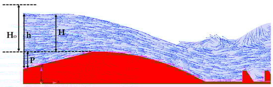 where Q is the discharge, which is measured in m3/s/m; Cd and B (m) are the discharge coefficient and the width of bay, respectively; H0 is the net energy over the crest, which is measured in m; g (m/s2) is the acceleration due to gravity; and P is the weir height. For the design discharge, the used and obtained values for Cd are reached as 0.640 and 0.626, respectively. In contrast, for the flood discharge, a Cd value of 0.726 is used in the simulations, whereas the model value reaches 0.716. The schematic diagram of UCF flows is presented in Figure 6.