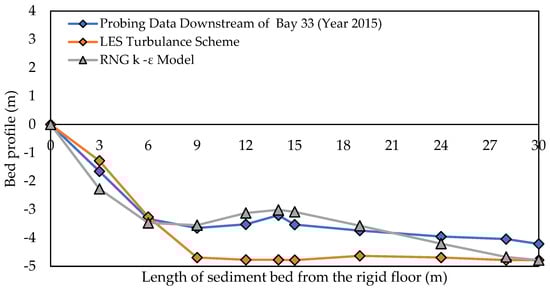 The data in the hard form are digitized in AutoCAD software. It is important to mention that, in the field data, the scour depths are measured at 10 different points in the flow direction [55]. The field staff measure these data points from the centerline of the bays. From the available 10 locations, the maximum scour depth values are taken for comparison. Hence, to compare the bed profiles downstream of Type II basin, the data from the computed scour depths are also obtained from the similar locations. Downstream of the rigid bed, up to X = 6, both LES and RNG K-ϵ turbulence models predicted identical results, which showed good agreement with the field data. However, afterward, due to the increase in recirculation and eddies in the scour hole, LES model showed higher length and depth of scour hole, which deviated from the field data. In the LES model, the overall change in the sediment bed reached 97%, while the results of RNG K-ϵ model agreed well with the field data, as shown in Figure 7.