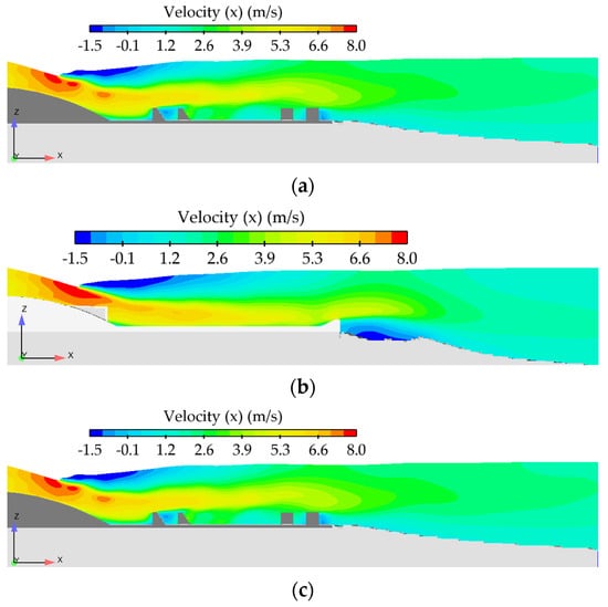 Figure 8 shows velocity distribution downstream of Type I, II, and III basins at 24.30 m3/s/m discharge using K-ϵ model. Figure 8a shows velocity patterns downstream of Type I basin and the results revealed highly turbulent flow on the fore side of HJ. The maximum forward and backward velocities were found at the downstream glacis and in the HJ regions, which reached 9 m/s and −2.56 m/s, respectively. The results also showed large fluid recirculations at the free surface. After the rigid floor, the velocity field on the scoured bed showed two different flow zones, i.e., slow-moving zone near the scoured bed and high-velocity zone from the central fluid region to free surface. In addition, the results also showed forward velocity contours downstream of Type I basin, which eroded/retrogressed the bed. At the initial length of the bed, the depth of the slow-moving wake zone was lower, which increased as the flow moved downstream.