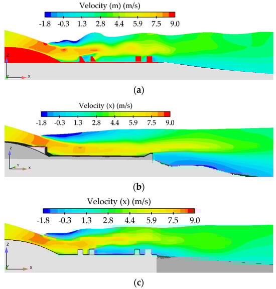 Velocity distribution downstream of different basins at 24.30 m3/s/m using RNG K-ϵ model: (a) Type I, (b) Type II, and (c) Type III.