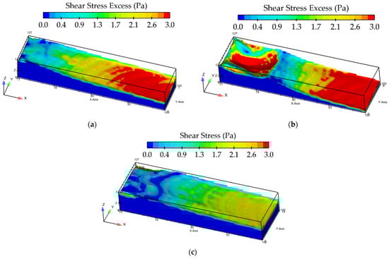 Distribution of shear stress downstream of different basins at design discharge of 24.30 m3/s/m using RNG K-ϵ model: (a) Type I, (b) Type II, and (c) Type III.
