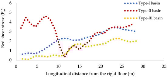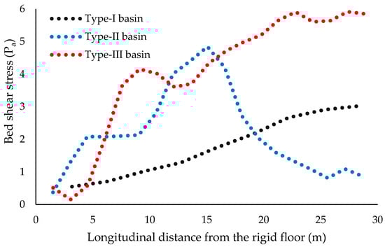 Figure 11 shows BSS downstream of Type I, II, and III basins at the design discharge. The plots are drawn from the centerline (Y/2) of the bed. Downstream of Type I basin, the BSS gradually increased as the flow moved toward the end of the sediment bed, whereas, downstream of Type II basin, the maximum BSS was found in the scour hole region. After the scour hole, the shear stress rapidly decreased due to the large fluid recirculation, which excessively retrogressed the bed. It is important to mention that, as the bed was eroded, the shear stress was found to be decreased. On the other hand, downstream of Type III basin, the BSS gradually increased towards the end of the sediment bed. Out of the studied basins, the maximum BSS was noticed downstream of Type III, which indicated the sediment particles were still intact and required higher critical shear stress to remove the particles from the bed surface. In conclusion, in comparison to Type II and Type III basins, the minimum shear stress was observed downstream of Type I basin, which reached 3 Pa.
