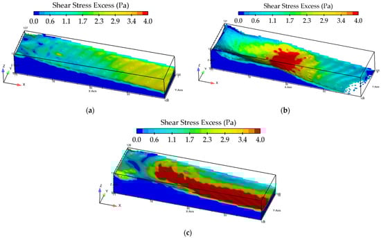 Figure 10 shows the BSS contours downstream of Type I, II, and III basins at 24.30 m3/s/m using K-ϵ turbulence model. From Figure 10a, the maximum magnitude of BSS downstream of Type I basin was found on the left side of the sediment bed, which increased the scour depths in those regions. Figure 10b shows the BSS downside of Type II basin using K-ϵ model. From Figure 10b, the results indicated maximum BSS within the scoured hole and on the downside of the scour hole. Figure 10c shows shear stress contours downstream of Type III basin and the results indicated that the maximum magnitude of BSS occurred on the right side of the sediment bed.