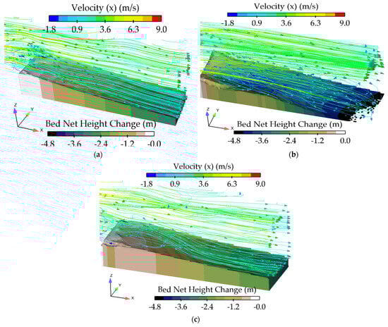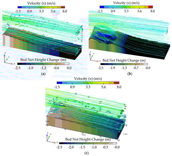 On the other hand, at 17.5 m3/s/m discharge, the velocity pattern in Type III basin was found to be dissimilar to that observed in Type I and II basins, as illustrated in Figure 9c. The results showed higher fluid recirculation in the roller region of HJ and indicated a stable HJ. The results further indicated that, after impacting with WSBB, the supercritical flow was directed towards the free surface. Furthermore, after the WSBB, a large wake zone region was noticed, which further reduced the magnitude of velocities near the basin’s floor. Due to the reduced velocity at the rigid floor, the depth of the slow-moving zone on the erodible bed was also reduced on the downside of Type III basin. At the start of retrogressed bed, the depth of slow-moving fluid was lower, whereas, as the fluid moved towards the end of the sediment bed, the depth of slow-moving fluid also increased, which consequently increased the erosion process in those regions. However, as compared to the Type I and II basin, the depth of central and higher velocity zones were found to be lower in Type III basin, which indicated that the high-velocity currents were moving above the central fluid depth and at the free surface.