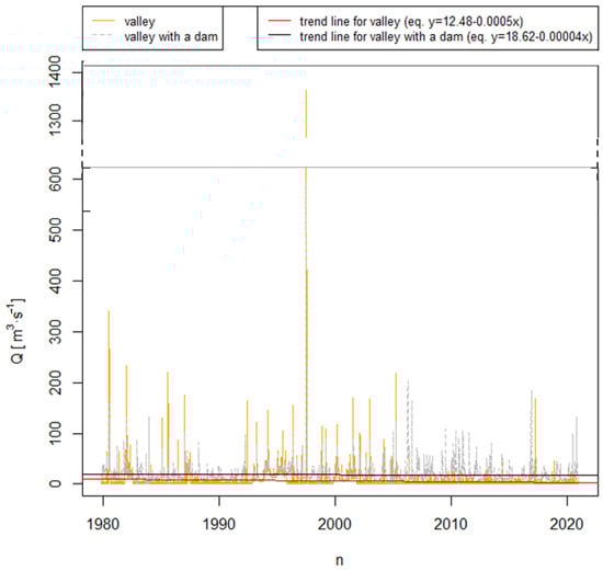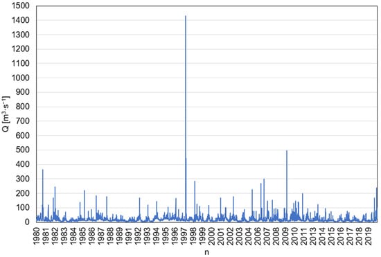 - The Institute of Meteorology and Water Management, the National Research Institute in Warsaw. Time Series of Flows of the Nysa Kłodzka River, Bardo Profile (1980–2020). 2023. Available online: https://danepubliczne.imgw.pl (accessed on 10 July 2023).