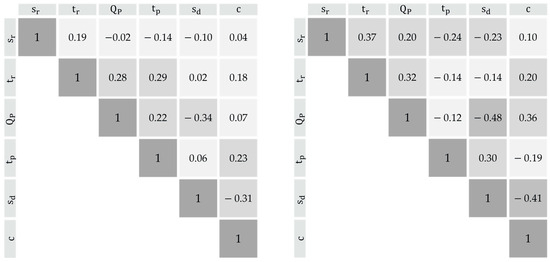 Consequently, the dependencies for the Emskirchen gauge (Middle Aurach) are described using Kendall’s τ (Figure 3). The left side shows the correlation matrix for the summer period, while the right side shows the winter period correlation matrix. Although the resulting values are comparable, they exhibit variations in some parameters. This discrepancy arises from the distinct genesis of the flood hydrographs, as explained in Section 2.3.2, and it describes the respective dependency measure between the measured values.