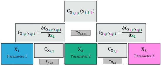 There exist diverse types of Vines [32]. In our scenario, we sequentially investigate dependencies, examining the relationship between the first and second elements, the second and third elements, and so forth. Figure 4 provides a visual representation of building a 3D vine copula with parameters X1, X2, and X3, where their pairwise dependencies are captured through the bivariate copulas and . Mathematical mapping is illustrated in the figure [45].
