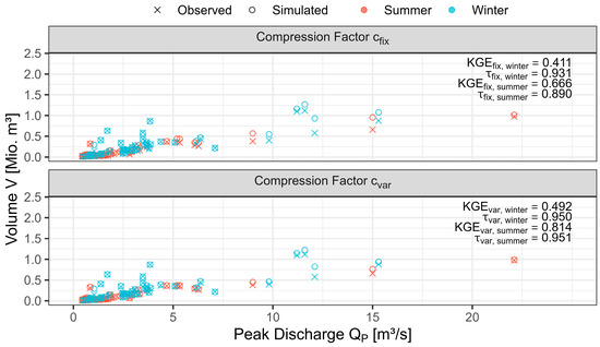 In the upper section, the genetically adjusted shape parameter for the descending branch remains constant with a compression factor of cfix = 1. In contrast, the lower section shows a variable adjustment of the shape parameter and compression factor, cvar, for the hyperbolic function of the descending branch. For both winter and summer events, a clear improvement in the simulated flood volumes becomes evident due to the variable compression factor. For example, KGE for summer events improves from 0.666 with compression factor cfix = 1 to 0.814 with a variable compression factor. The correlation also improves from 0.89 to 0.951.