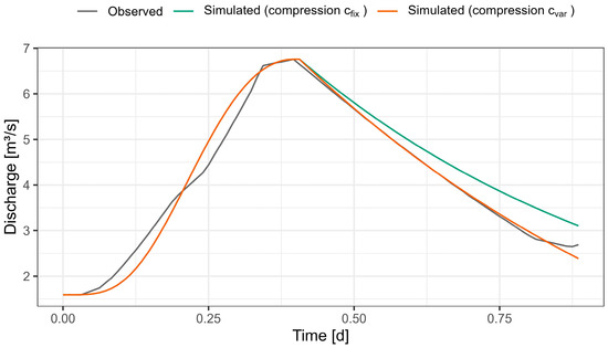 An additional improvement by incorporating another parameter (compression factor, c) through the adaption of genetic algorithms is shown in Figure 4. This leads to an enhancement in the goodness of fit for the descending branch (Figure 5). Thus, the volume of the flood hydrograph, for instance, in the dimension of hydraulic structures (e.g., weir or river levees) can be associated with higher reliability by integrating this additional parameter.