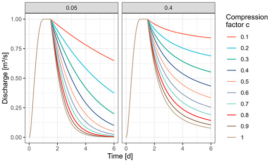 It is worth emphasizing that increasing the bandwidth of sd can also encompass a significantly broader spectrum of hydrographs. In contrast, this improvement can not only be corrected in the same way via the variable adjustment of the compression factor but can also be amplified. Consequently, it is possible to not only ascertain the extent of the descending branch within a specified period but also facilitate significant stretching of the originally compressed shape, exerting a substantial influence on the rate of the descent of the descending branch. The simultaneous application of both variables leads to an improvement, as exemplified in Figure 5.