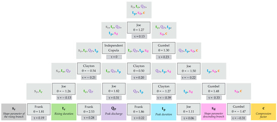 In the current application, a six-dimensional copula can be constructed as an example according to the concept of Vines based on the correlational parameters (tr, sr, QP, tp, sd, and c) for the winter period [49]. The detailed structure, including the appropriate copulas, is further described by using the subsequent visualization (Figure 8).