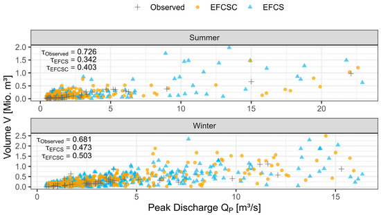 The figure displays the volume and peak discharges derived from the observed data (gray), as well as the volume and peak discharges generated synthetically using the EFCS approach (blue) and the newly developed EFCSC approach (orange). Both simulations are based on the adjustment of six variables using genetic algorithms (Section 3.1). The data are further divided into the summer and winter half-year periods.
